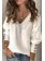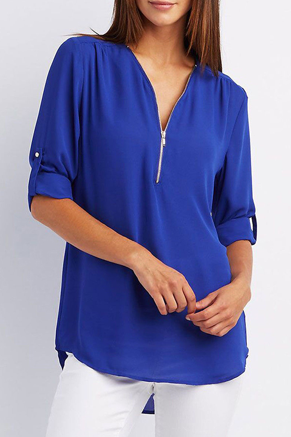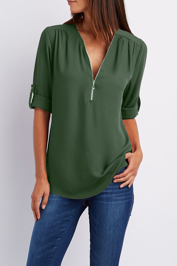 V-Neck Zips Plain Roll-Up Sleeve Long Sleeve Blouses