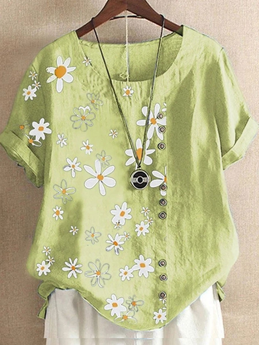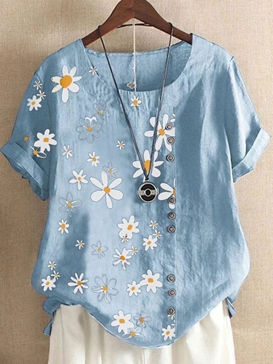 Casual Cotton And Daisy Printed Short-Sleeved Blouse