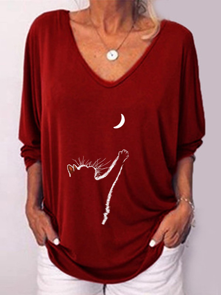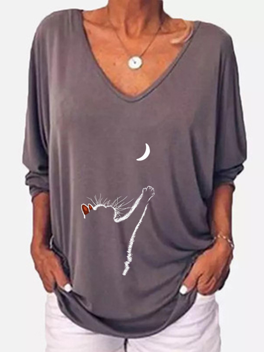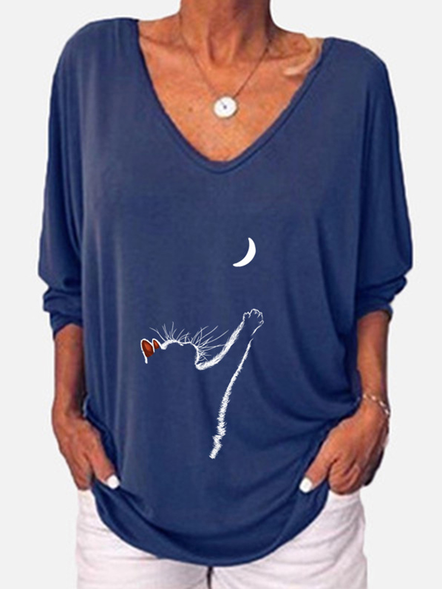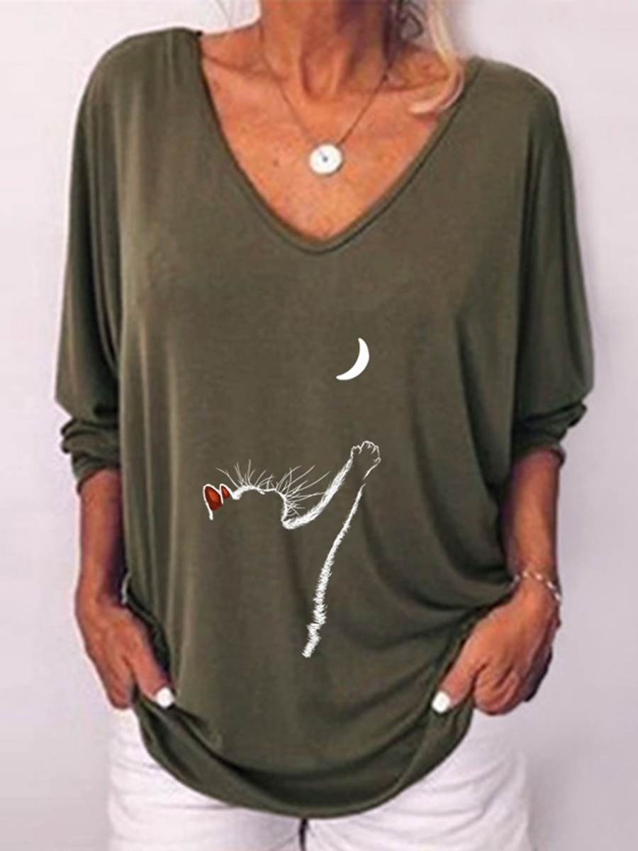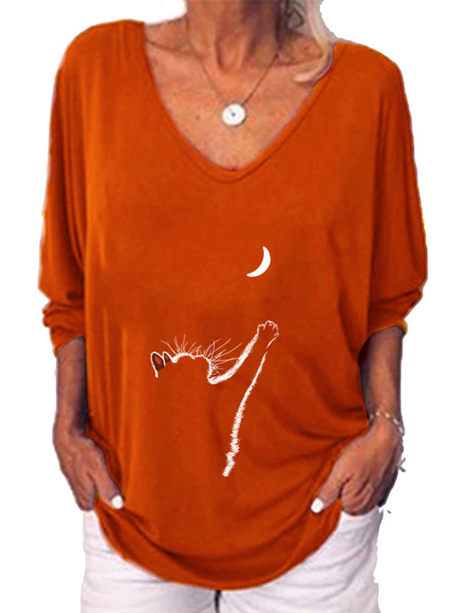 Women Cat Print Three-quarter Sleeve Casual T-shirt