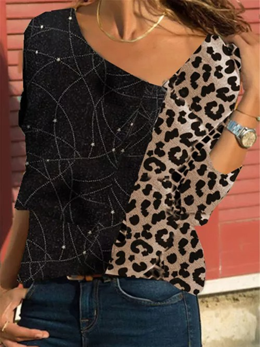Leopard Print Long Sleeve Stitching T-Shirt