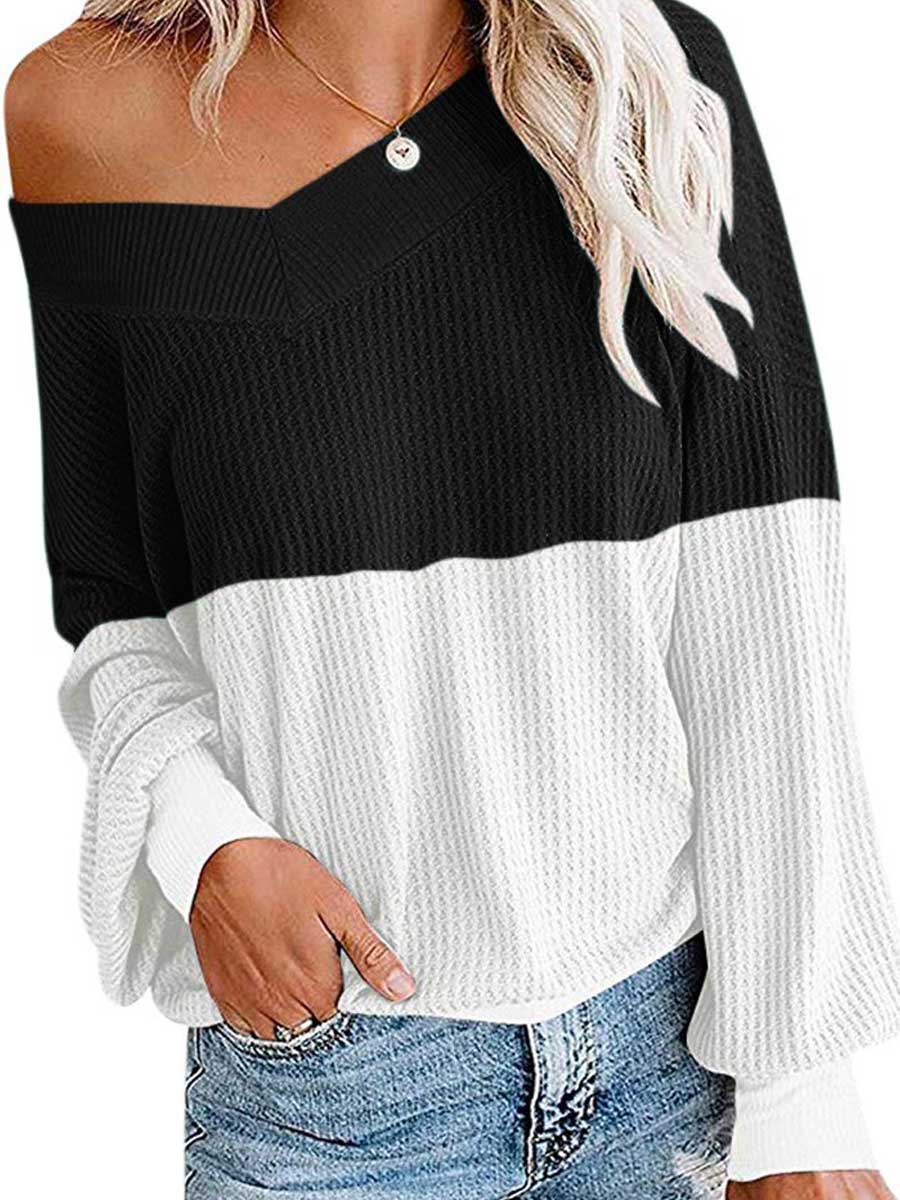 Stitching Contrast Color V-neck Women Long-sleeved T-shirt
