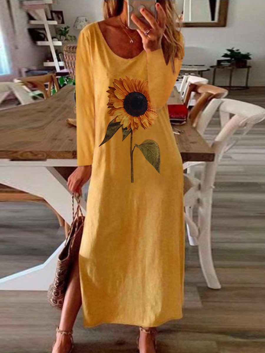 Sunflower plant printed side slit long sleeve dress