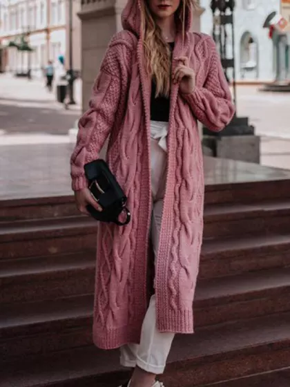 Solid color hooded long twist cardigan sweater