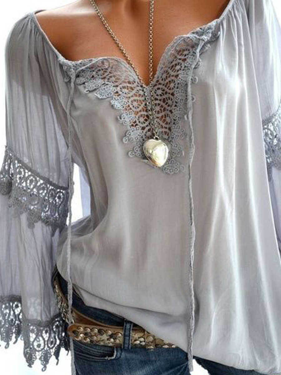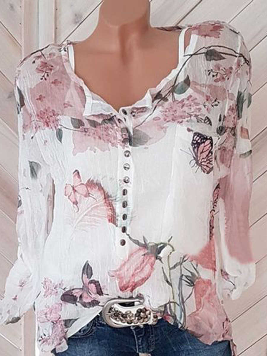 Solid Color Long Sleeve V-Neck Button Ladies Shirt Women's Clothing Report